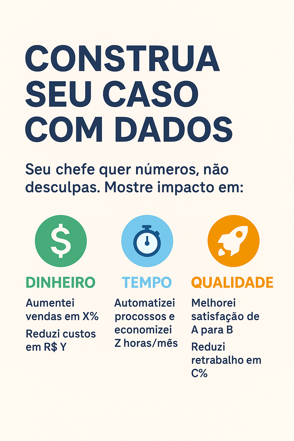 - 🚀 Melhorou a qualidade? “Aumentei a satisfação do cliente de A para B” ou “Reduzi o retrabalho em C%”.
